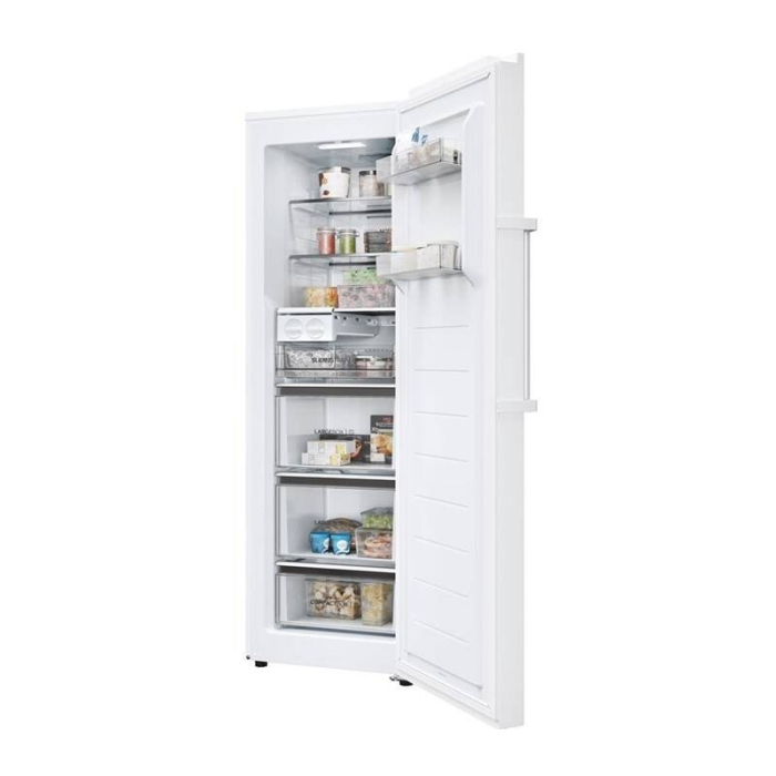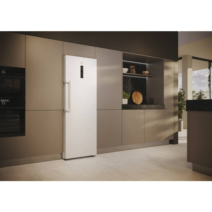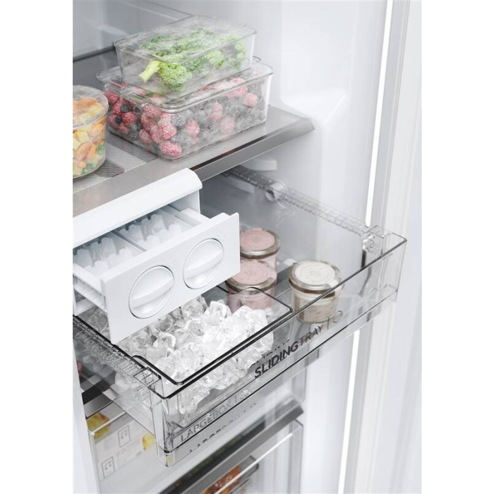 Skriňová mraznička Haier H4F272WCH1 v bielej farbe ponúka kapcitu 276 l. Patrí do energetickej triedy C. Vďaka funkcii Switch Zone je môžné nastaviť vyššiu teplotu a používať ju ako chladničku. Je vybavená invertorovým kompresorom, beznámrazovou technológiou No Frost, funkciou rýchle mrazenie, elektronickým ovládaním, LED osvetlením a WiFi + Bluetooth pripojením. Vo vnútri sa nachádzajú 3 sklenené police, 3 transparentné zásuvky, 2 dverové priehradky, 1 zásuvka Sliding Tray a otočný výrobník ľadu Twist Ice.