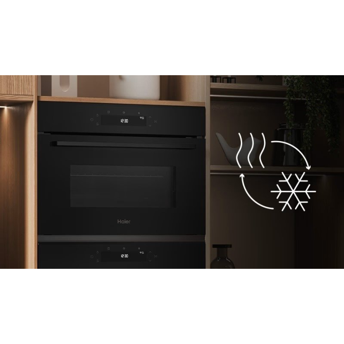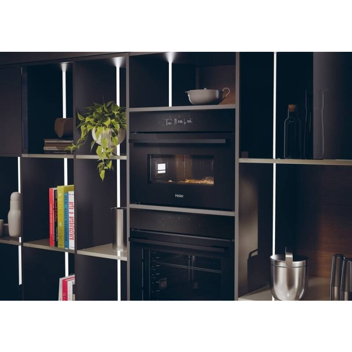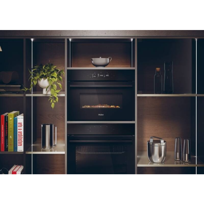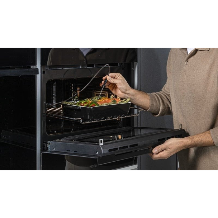 Mikrovlnná vstavaná rúra Haier H4MWID49G6NQB s kapacitou 44 litrov ponúka viacúrovňové pečenie až v 4 úrovniach naraz. Samozrejmosťou je mikrovlnný ohrev, gril či kombinácia programov. Ponúka 12 základných programov a špeciálne programy: teplovzdušné fritovanie Air Fry, Sušenie, Jogurt, Kysnutie a rozmrazovanie. Plne dotykové ovládanie ID Premium je veľmi intuitívne. LCD displej je rozdelený do 3 častí, na ktorých pohodlne nastavíte funkcie, teplotu a čas. Technológia Inverter zaistí primeraný výkon pre rovnomerné pečenie a ohrievanie každého pokrmu. Doplnkové funkcie a programy v aplikácii hOn vám pomôžu vyťažiť zo svojej rúry maximum.