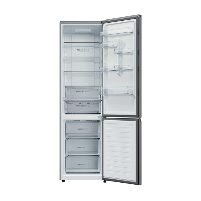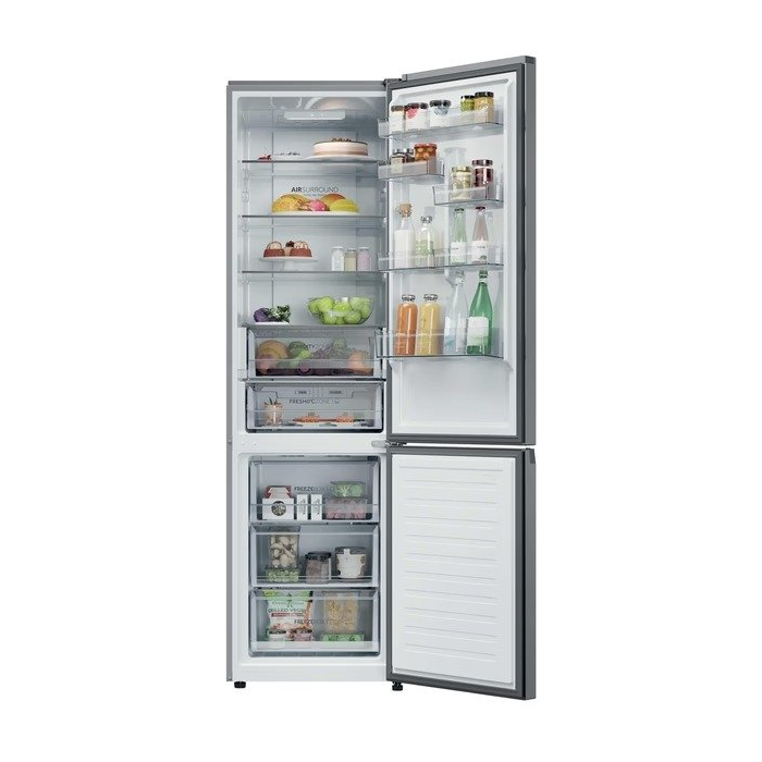 S beznámrazovou technológiou Haier Air Surround Fresher Tech prúdi vzduch vo vnútri chladničky jemnejším a šetrnejším spôsobom. Vďaka špeciálnym bočným vývodom na zadnej stene tento systém distribuuje studený vzduch homogénne v kruhoch v celom priestore chladničky. Tým bráni priamemu prúdeniu na potraviny a strate hmotnosti a vysušeniu. To je dôvod, prečo si potraviny skladované s Haier Air Surround zachovávajú chuť, konzistenciu a šťavnatosť jedla až o 99 %* po 7 dňoch ako prvý deň.