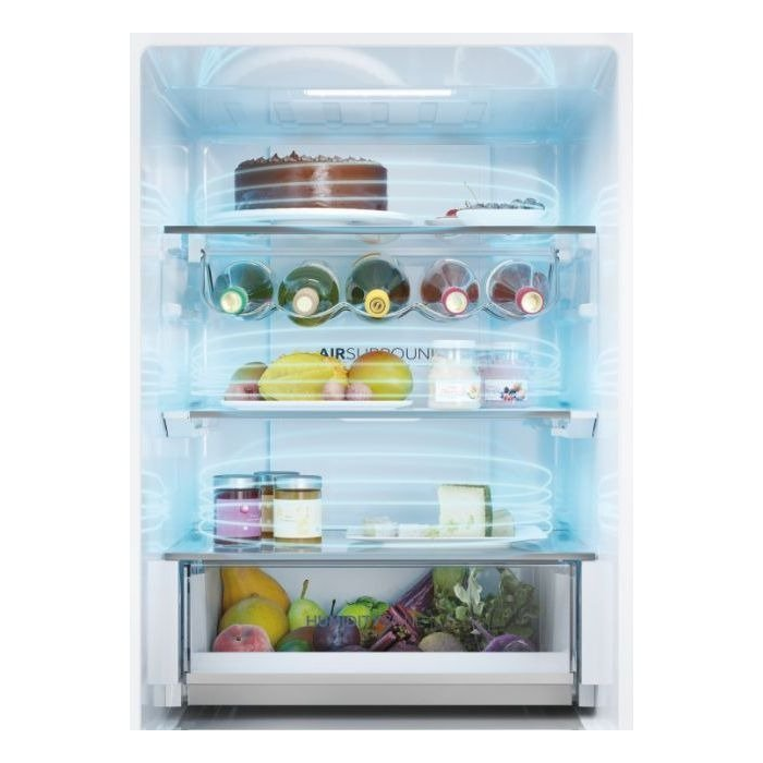 S beznámrazovou technológiou Haier Air Surround Fresher Tech prúdi vzduch vo vnútri chladničky jemnejším a šetrnejším spôsobom. Vďaka špeciálnym bočným vývodom na zadnej stene tento systém distribuuje studený vzduch homogénne v kruhoch v celom priestore chladničky. Tým bráni priamemu prúdeniu na potraviny a strate hmotnosti a vysušeniu. To je dôvod, prečo si potraviny skladované s Haier Air Surround zachovávajú chuť, konzistenciu a šťavnatosť jedla až o 99 %* po 7 dňoch ako prvý deň.