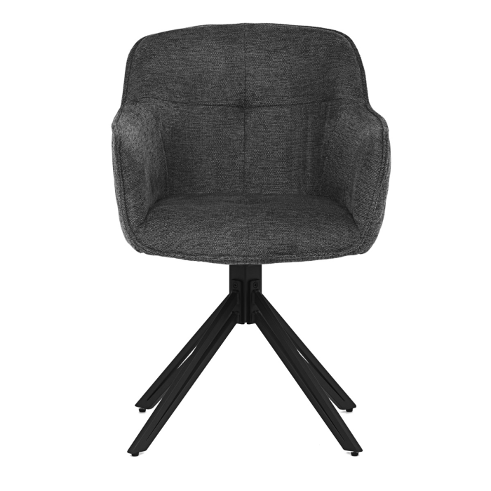 Jídelní a konferenční židle skořepinové konstrukce v zajímavém designu a ve velmi žádaném industriálním / loft stylu. Židle disponuje otočnou funkcí L90°/P90° s automaticky vratným mechanismem. Konstrukce sedáku i opěradla má pevnou kovovou kostru, potah je z jemně hrubé látky v šedém odstínu. Polstrování je z pevné PU pěny, na sedáku v hustotě 28 kg/m3 a na opěradle 24 kg/m3. K pohodlí posedu poslouží nejen bohaté polstrování, ale i praktické a pohodlné opěrky rukou. Příjemný dekorativní prvky tvoří centrální čalounický vtah na opěradle a z vnější strany kosočtvercové prošívání. Nedílnou součástí je široká látková paspule v barvě židle, lemující celý obvod. Stabilitu zajišťuje designovaná čtyřnohá podnož s centrálním uchycením skořepiny. Konstrukce jednotlivých paprsků nohou je čtvercového průřezu, odlehčena středovým průzorem. Povrchová úprava je kvalitním práškovým nástřikem v černé matné barvě. Podnož židle je rektifikovatelná, na každém paprsku nohy je výškově nastavitelný kluzák s plastovým krytem. Ten zamezí možnosti poškození tvrdých podlah. Tento model je dobrou volbou pro Váš výběr do jídelních nebo obývacích prostor, hodí se i jako konferenční židle, kde ale musíte oželit možnosti jejího otáčení. Nosnost je do 120 kg, Základní rozměry – celková šíře 57 cm, celková hloubka 58 cm, celková výška 84 cm a výška sedu 50 cm. Montáž není složitá, zvládne ji i méně zručný nový majitel této židle.