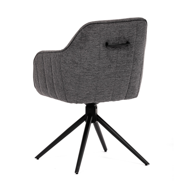 Moderní jídelní židle v šedé barvě s efektním prošitím zádové i přední části opěráku. Prošití je v brvě potahového materiálu. Zadní část opěráku je opatřena vkusným madlem pro snazší manipulaci. Čtyři kovové nohy v matném práškovém nástřiku vycházejí z centrálního bodu ve středu sedáku. Sedák je otočný o P90°+ L 90° s vratným mechanismem - funkce reset.