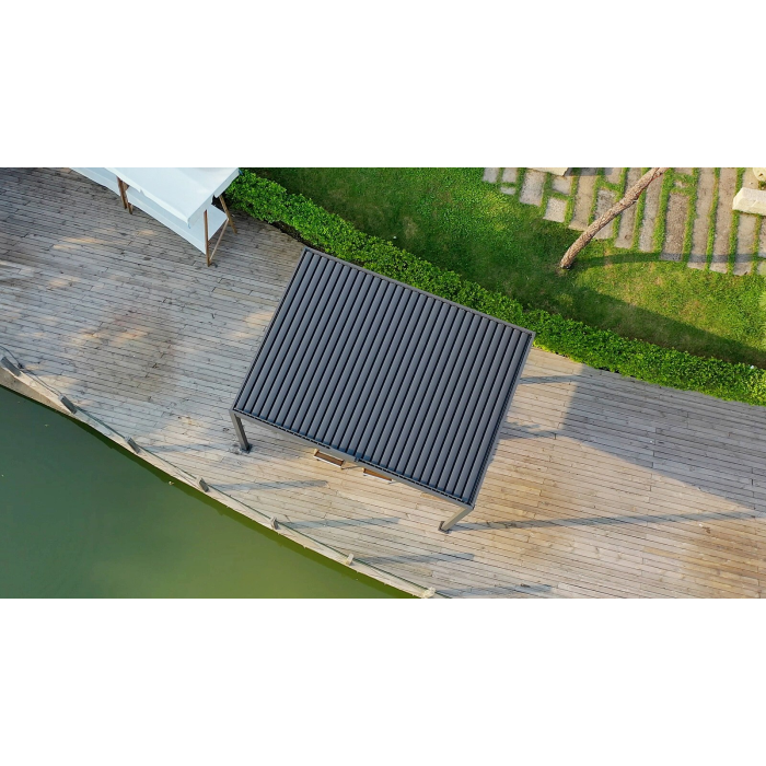 Voľne stojaca bioklimatická pergola LANITPLAST PREMIUM s rozmermi 5 x 3 metra s plochou strechou je praktickým a elegantným riešením na zastrešenie vonkajšieho posedenia na Vašej záhrade. Robustná a stabilná konštrukcia v modernom antracitovom odtieni RAL 7043 s matnou povrchovou úpravou sa ľahko začlení do akéhokoľvek prostredia a nevyžaduje kotvenie do steny. Celá pergola vrátane otočných lamiel je vyrobená z hliníka, všetko je opatrené vypaľovaným práškovým lakom (komaxit). Celkom 37 otočných lamiel poskytuje spoľahlivú ochranu pred slnečnými lúčmi aj dažďom. Ich sklon je možné plynule nastaviť od úplne uzavretej polohy (0°) až po plné otvorenie v uhle 90°. Ovládanie lamiel je manuálne a prebieha pomocou praktickej kľučky, ktorá je konštruovaná tak, aby bolo možné ju nakloniť a zabrániť tak poškodeniu povrchu pergoly pri manipulácii. Jej umiestnenie navyše umožňuje bezproblémové používanie ďalších doplnkov, ako sú bočné zásteny alebo moskytiéry bez toho, aby obmedzovala ich funkčnosť.