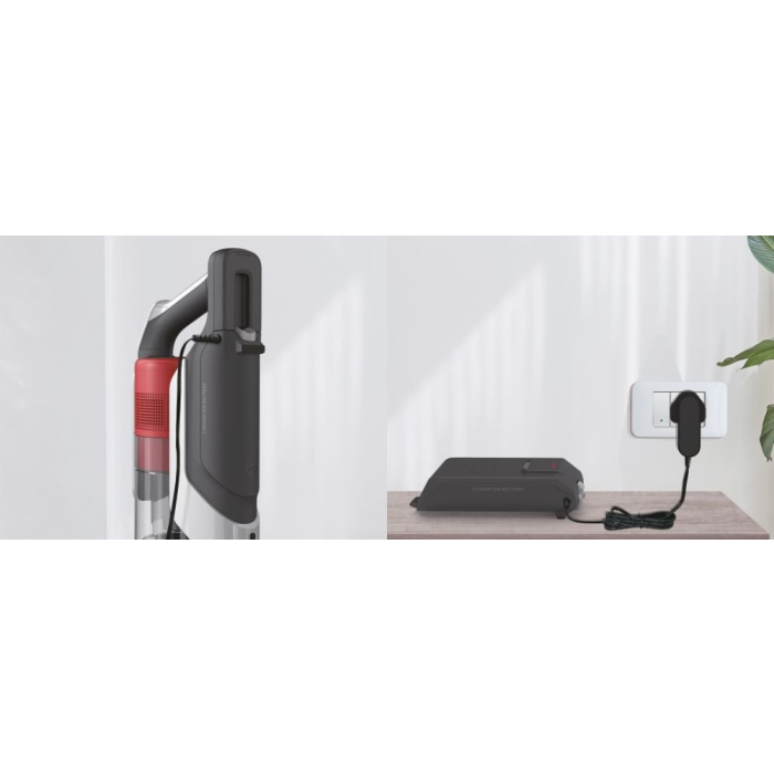 Multifunkčný - tyčový a ručný akumulátorový vysávač, samostatný cyklón, 21,6 V Lion, až 30 min prevádzky, Bezkefový motor - vysoký výkon vysávania, ANTI-TWIST™ - motorizovaná hubica na všetky povrchy s integrovaným hrebeňom proti namotávaniu vlasov a nečistôt, LED displej na rukoväti, pruhové LED osvetlenie na hubicu