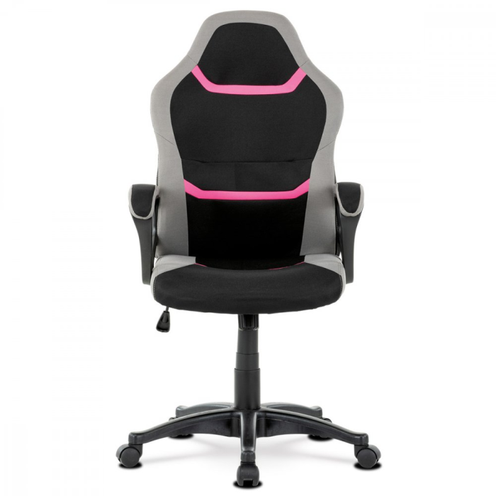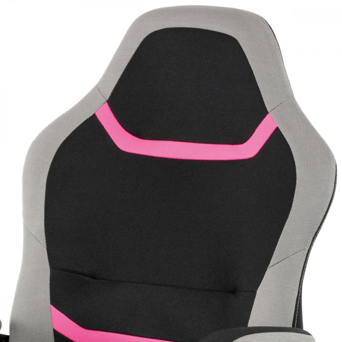 Elegantní kancelářská i herní židle se zaoblenými liniemi, obvodovým prošitím v šedé barvě a výrazným tvarovým prošitím sedáku i opěráku. Potah je kombinací černé a světle šedé látky hladké látky s decentním růžovým detailem na opěráku i sedáku. Polstrování je z kvalitní PU pěny. Židle je vybavena houpacím mechanismem s nastavením protiváhy a aretací v základní poloze. Tuhost protiváhy lze regulovat velkým plastovým šroubem, umístěným pod sedákem. Výška sezení se upravuje páčkou na pravé straně přes kvalitní plynový píst. Znavené ruce si velice pohodlně položíte na plastové područky, na ložné ploše polstrované černou a šedou látkou. Šíře područek je úžasných 7,5 cm, ložná plocha 31 cm a výška 3 cm. Opěrák je vyšší, částečně prodyšný a s integrovanou statickou opěrkou hlavy. Zvýšené okraje sedáku i opěráku podporují správné držení těla i páteře a slouží jako výborná opora. Kříž je černý plastový o průměru je 65 cm, což zajišťuje výbornou stabilitu i u fyzicky náročnějších her. Kolečka jsou plastová pr. 5 cm. Nosnost židle je až 120 kg.