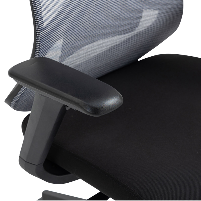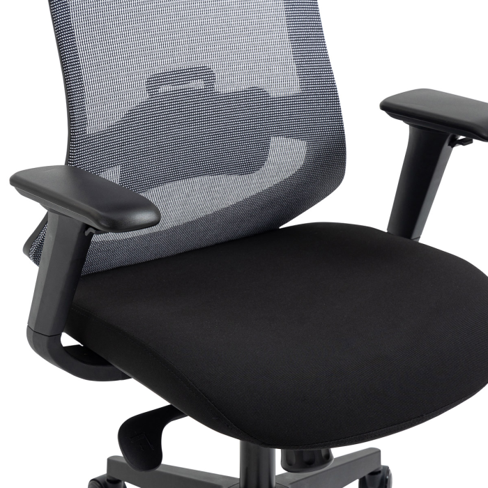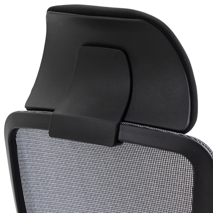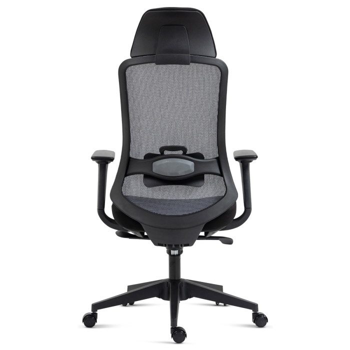 Kancelářská židle s vysokým opěrákem, čalouněným v prodyšném materiálu MESH, s nastavitelnou bederní opěrkou. Sedák je vyměkčený, s potahem v černé látce. Pro větší pohodlí je židle opatřena synchronní mechanikou s polohovací aretací, podhlavníkem a 4D područkami z vrchní části z PU pěny. Kříž z odolného plastu je opatřen kolečky na tvrdé povrchy.