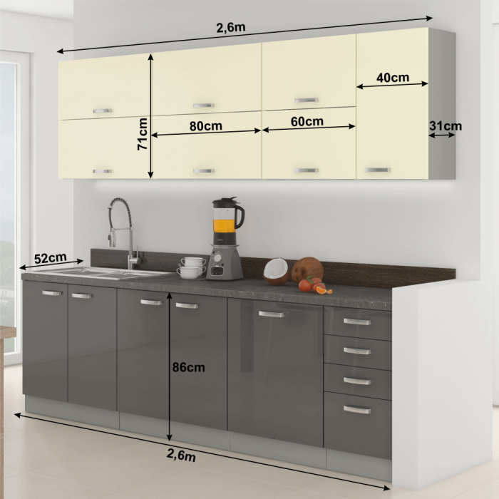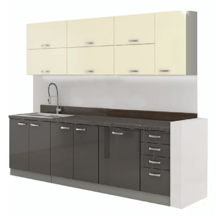Kuchynská linka, sivá/kremová, extra vysoký lesk, PRADO