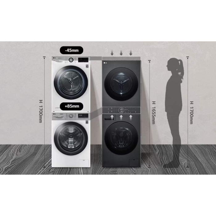LG WashTower má všetky výhody pracieho stĺpca s naskladanou práčkou a sušičkou, ale na menšom priestore. V porovnaní s kúpou samostatnej práčky a sušičky spojených spojovacím dielom je LG WashTower o 4,5 cm nižší, takže ho môžete nainštalovať aj do menších priestorov. Ponúka tiež pohodlnejšie používanie, keďže jeho ovládací panel je vyšší o 8,5 cm.