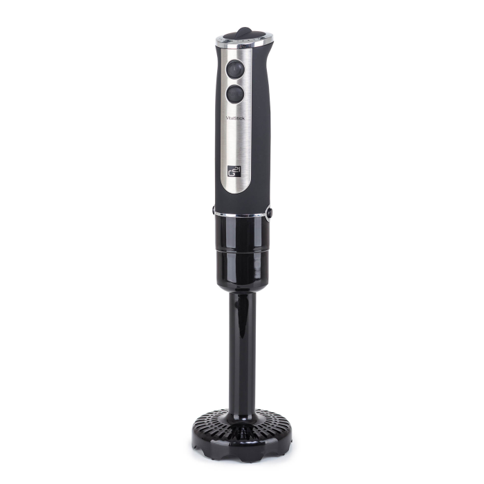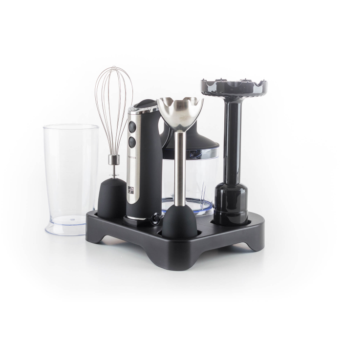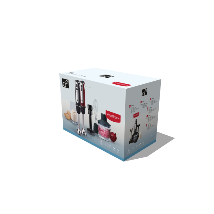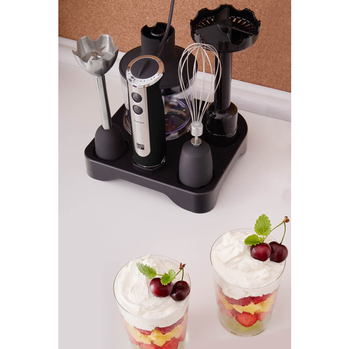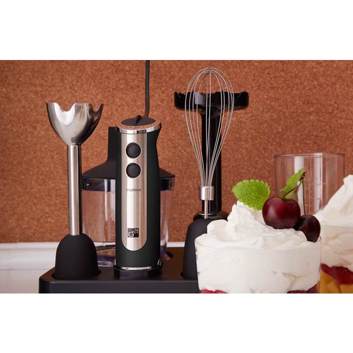 Multifunkčný tyčový mixér G21 VitalStick v čiernej farbe s výkonom 800 W. Unikátne rozloženie nožov 3D Quattro blade systém pre mixovanie v 4 úrovniach. Mixovací nástavec, šľahacia metla, nástavec na pyré, nádoba na sekanie, nádoba na šľahanie, stojan.