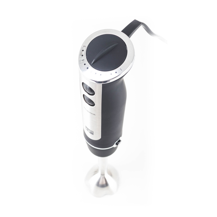 Celé telo mixéra je kovové. Krásny dizajn a premyslený tvar vám umožní absolútne pohodlnú manipuláciu aj držanie. Mysleli sme na všetko, takže oceníte aj ústretovo umiestnené ovládacie prvky a praktický stojan, do ktorého mixér aj s príslušenstvom ľahko umiestnite.