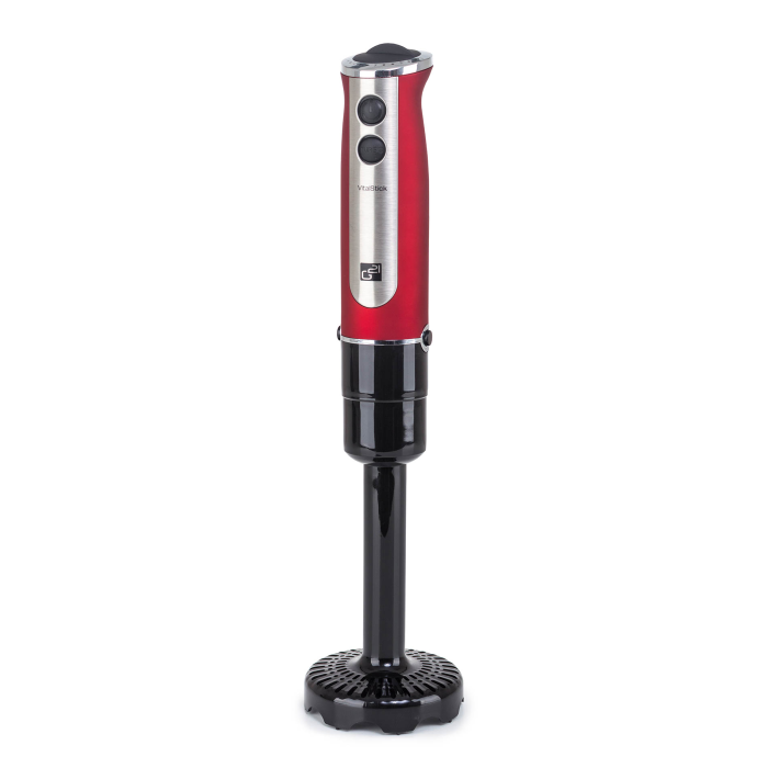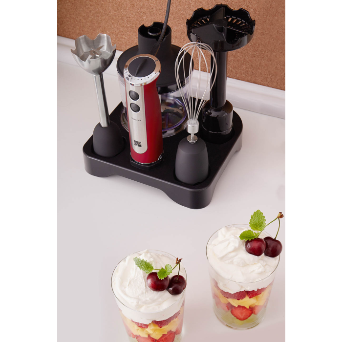Multifunkčný tyčový mixér G21 VitalStick v červeno - čiernej farbe s výkonom 800 W. Rozloženie nožov 3D Quattro blade systém na mixovanie v 4 úrovniach. Mixovací nadstavec, šľahacia metla, nadstavec na pyré, nádoba na sekanie, nádoba na šľahanie, stojan.