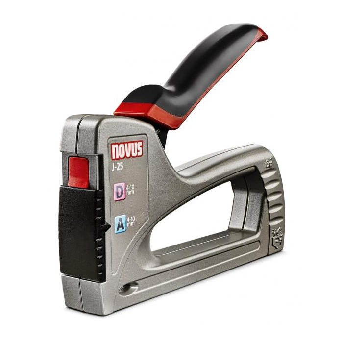 Posuvný mechanizmus na ľahké prepínanie medzi tenkými spinkam a spinkami z plochého drôtu, ergonomická mäkká rukoväť, spodný plniaci zásobník s bezpečnostnou poistkou na ľahké plnenie spinkami, zámok rukoväte pre skladovanie, kontrolné okienko na sledovanie stavu naplnenia zásobníka. Kapacita: (A) spinky 150 ks, (D) spinky 85 ks.