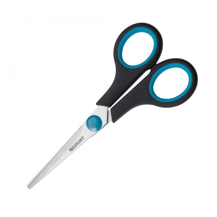 Nožnice s mäkkou modro-čiernou rukoväťou, ostrie z nehrdzavejúcej ocele.