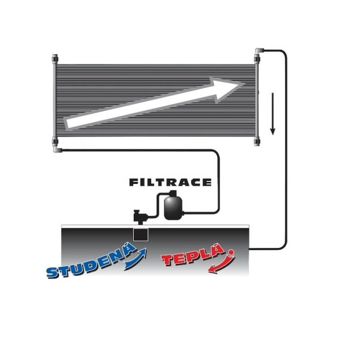 Solárny panel Slim 360 pohlcuje tepelnú energiu slnečných lúčov a odovzdáva ju vode, ktorá panelom prúdi. Chladná voda z bazéna je pomocou bazénovej filtrácie vháňaná do solárneho panelu, kde sa ohrieva a vracia sa späť do bazéna. Solárny panel Slim napojíte na hadice s priemerom 32 aj 38 mm.