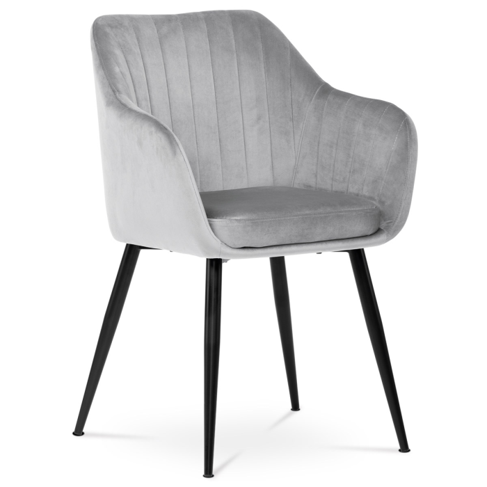 Dokonalý design, industriální styl a perfektní pohodlí je pro tuto židli samozřejmostí. Skořepina sedáku i opěradla má pevnou kovovou kostru, potah z velmi kvalitní sametové látky v matném provedení v trendy odstínu stříbrné. Polstrování je z PU pěny. Bonusem ke zvýšení pohodlí posedu je 8 cm zvýšený a extra polstrovaný sedák a praktické pohodlné opěrky s opěrnou plochou ve výšce 69 cm od podlahy. Příjemný dekorativní prvek vytvářejí svislá prošití vnitřních částí opěradla i boků. Použitá látka je velmi odolná a perfektně se čistí. Stabilitu židle zajišťují čtyři kónické kovové nohy s kvalitním práškovým nástřikem v černé matné barvě. Ukončené jsou černými plastovými kluzáky, zabraňující poškození tvrdých povrchů podlah. Nohy mají kruhový průřez o průměru od 2 do 3,5 cm v horní části. Všechna tato plus produkují z tohoto modelu skvělou volbu pro Váš výběr zařízení jídelních a nebo obývacích prostor, ale skvěle se hodí i jako konferenční židle do zasedacích místností. Nosnost židle je až 120 kg. Základní rozměry jsou – celková šíře 58 cm, celková hloubka 57 cm, celková výška 84 cm, výška sedu 52 cm a hloubka sedu 43 cm.