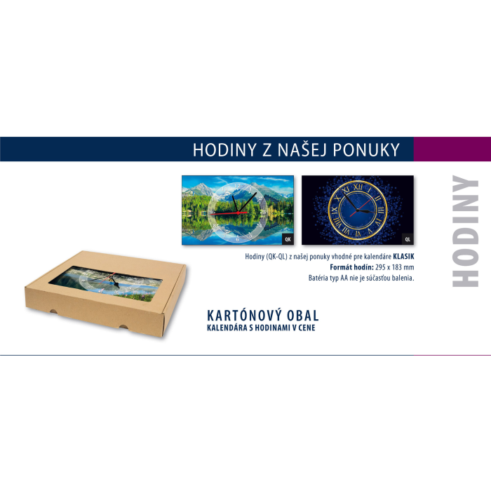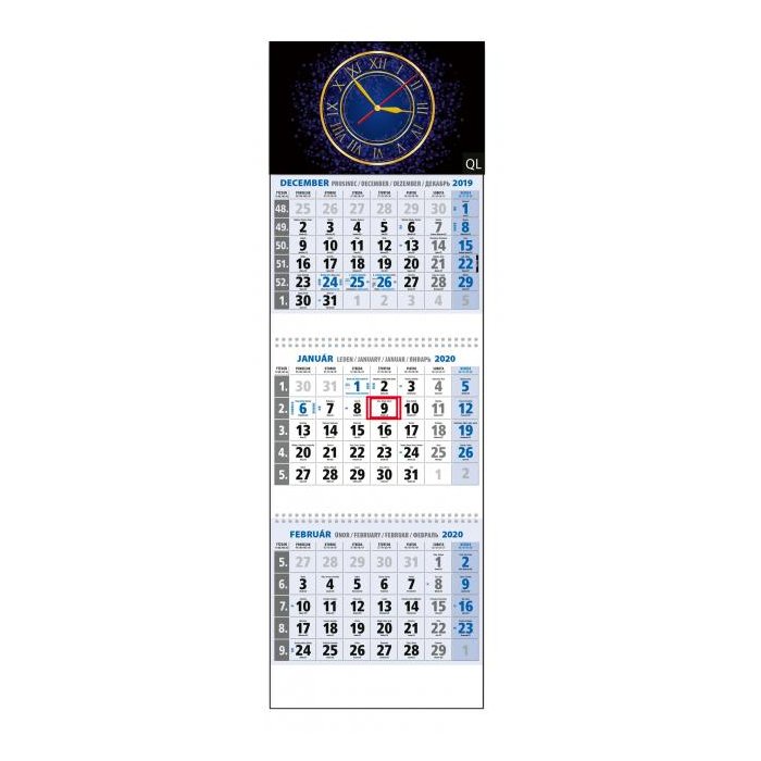 • ROZSAH: 3 x 12 listov. KALENDÁRIUM: 3-mesačné s menami SK, názvy mesiacov a dní v SK. VÄZBA: 1x šitá s perforáciou, 2x špirála. REKLAMNÁ POTLAČ: 2 x 295 x 30 mm, 295 x 60 mm. BALENIE: 20 ks.S motívom hodín QL.