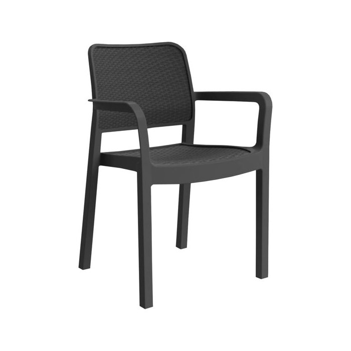 Nízkoúdržbová záhradná stolička, maximálna nosnosť až 110 kg, vysoká odolnosť voči rôznorodým vplyvom, ergonomicky profilované operadlo, stabilné podrúčky, stohovateľný dizajn pre ľahké uskladnenie. PP živice. Vysoko stála grafitová farba.