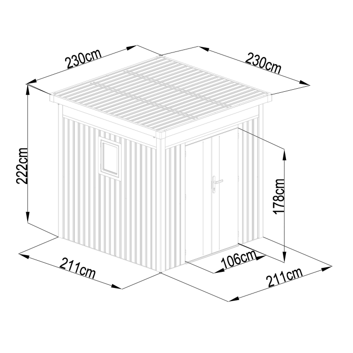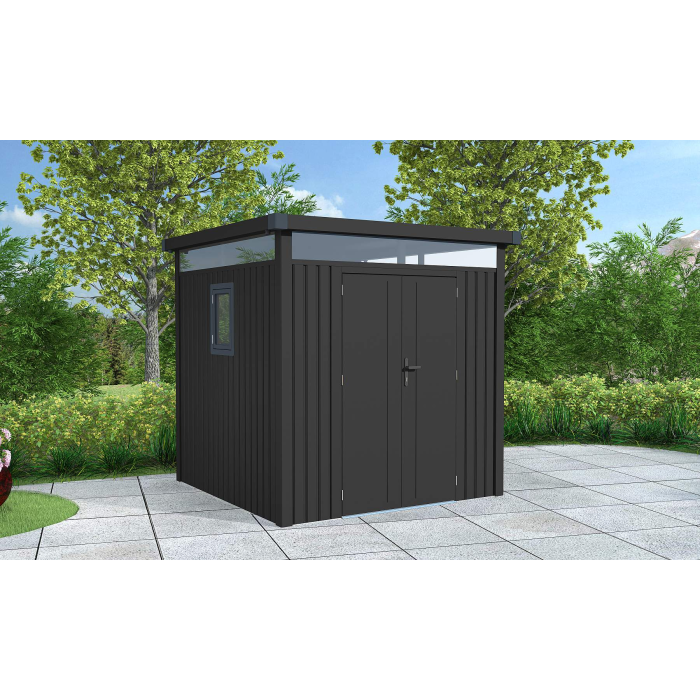 Táto praktická konštrukcia váži 174 kg a má antracitovú farbu, ktorá sa ľahko začlení do každého vonkajšieho prostredia. Plochá strecha a dvojité krídlové dvere s rozmermi š 106 x v 178 cm dodávajú domčeku jednoduchý a moderný vzhľad.