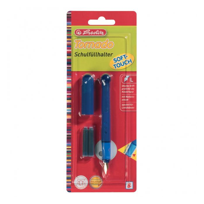Plniace bombičkové pero L - Tornado - pre ľavákov, hrot z ušľachtilej ocele, ergonomické pogumované držanie, nálepka s menom, balenie v blistri, mix farieb.