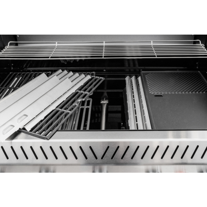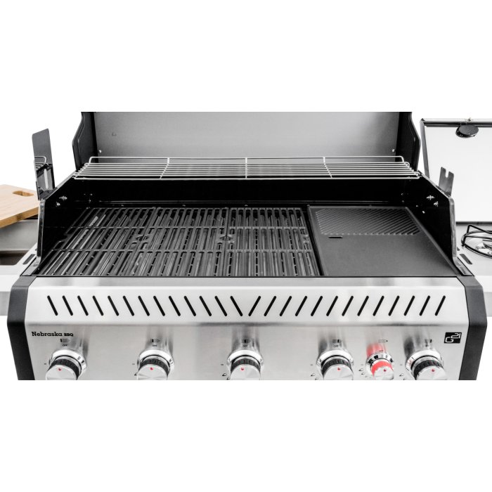 Päť hlavných horákov s výkonom 3,5 kW poskytuje dostatočný výkon na prípravu väčšieho množstva jedál naraz, či už ide o mäso, zeleninu alebo ryby. Bočný horák s výkonom 3,15 kW využijete na prípravu príloh, ohrev omáčok či varenie. Gril je vybavený tromi liatinovými roštami a jedným liatinovým plátom, ktoré rovnomerne rozvádzajú teplo. Súčasťou výbavy je aj nerezový rošt na ohrev. Ten je ideálny na odkladanie hotových pokrmov bez toho, aby došlo k ich pripaľovaniu.