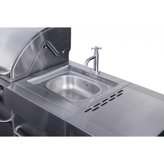 Všetko na jednom mieste – môžete zároveň grilovať, na bočnom horáku dusiť prílohovú zeleninu a použitý riad hneď oplachovať vo vstavanom dreze, bez nutnosti prenášať grilovacie vybavenie neustále do domu a späť.