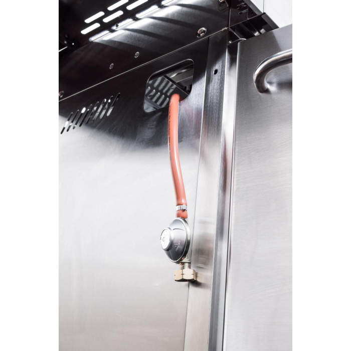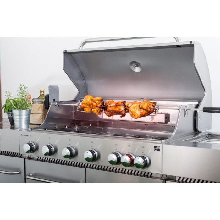 Nerezový plynový gril G21 Nevada BBQ na kura, steak alebo na gyros, grilovacia ihla s motorom. Gril s liatinovým roštom, teplomerom a bočným horákom, dohromady 8 horákov (8 x 4kW), systém Flame Tamer. Vstavaný drez, doska na krájanie, plynová regulácia.