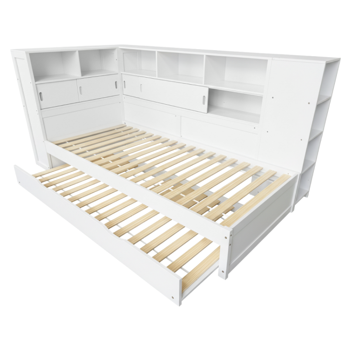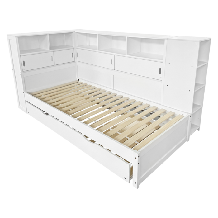 Posteľ s prístelkou a úložným priestorom, kaučukové drevo/biela, AUSTIN NEW