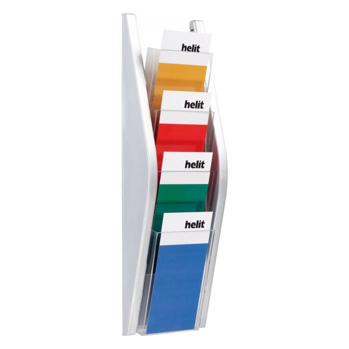 Štyri priehľadné priehradky slúžia na umiestnenie materiálov formátu 1/3 A4. Materiál kvalitný plast. Rozmery (š x v x h) 165 x 540 x 80 mm. Farba strieborná.