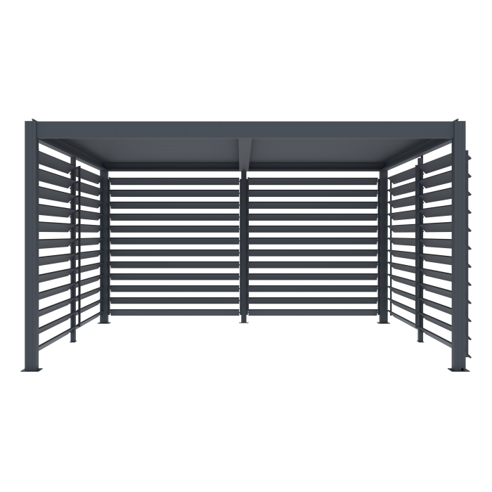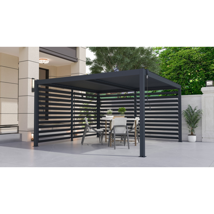 Bočná lamelová stena z manuálne nastaviteľných lamiel je ideálnym doplnkom pergoly Austin. Poskytuje maximálnu flexibilitu, ochranu a komfort – vďaka variabilne otočným lamelám si ľahko nastavíte požadovanú úroveň tieňa, súkromia alebo ochrany pred dažďom či vetrom.