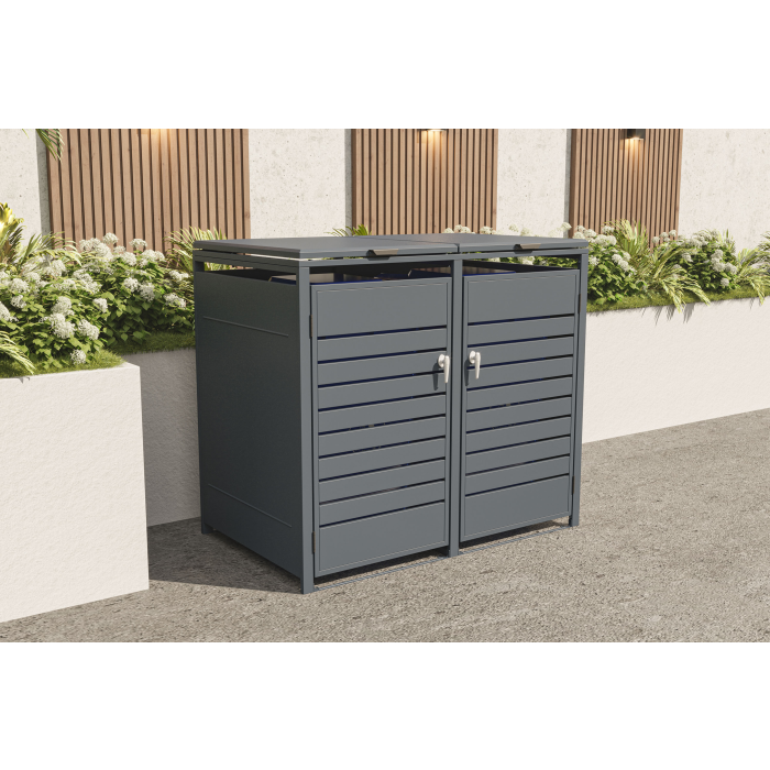 Prémiová oceľ s hrúbkou 0,8 mm, plynové vzpery, plná zadná stena na umiestnenie do priestoru, určený pre 2 smetné nádoby do objemu 240 l, antracitová farba.