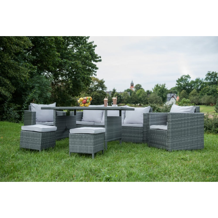 Je synonymom pre luxus a nadpriemerný štýl. Nábytok je vyrobený zo syntetického ratanu, odolný voči škodlivým poveternostným podmienkam. Úplne originálna nábytková línia dobyje srdcia najnáročnejších zákazníkov. Ratanový nábytok Calmo Grande poskytuje maximálne pohodlie. Silné a pohodlné vankúše na sedenie a operadlo vás povzbudia, aby ste trávili voľný čas vonku. Táto exkluzívna záhradná súprava bude skvelou ozdobou každého vonkajšieho priestoru. Farba súpravy: hnedá sivá, nerovná. Pletenie: 7-8 mm technorattan x 1,2 mm, hladká konštrukcia. Nábytková konštrukcia: oceľ.