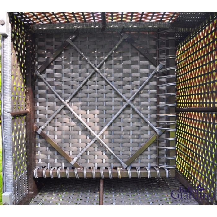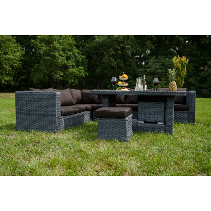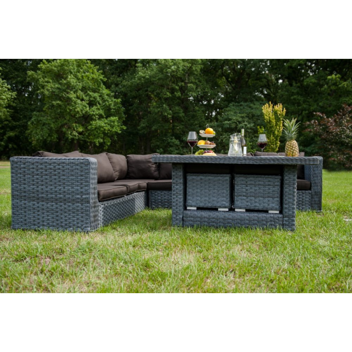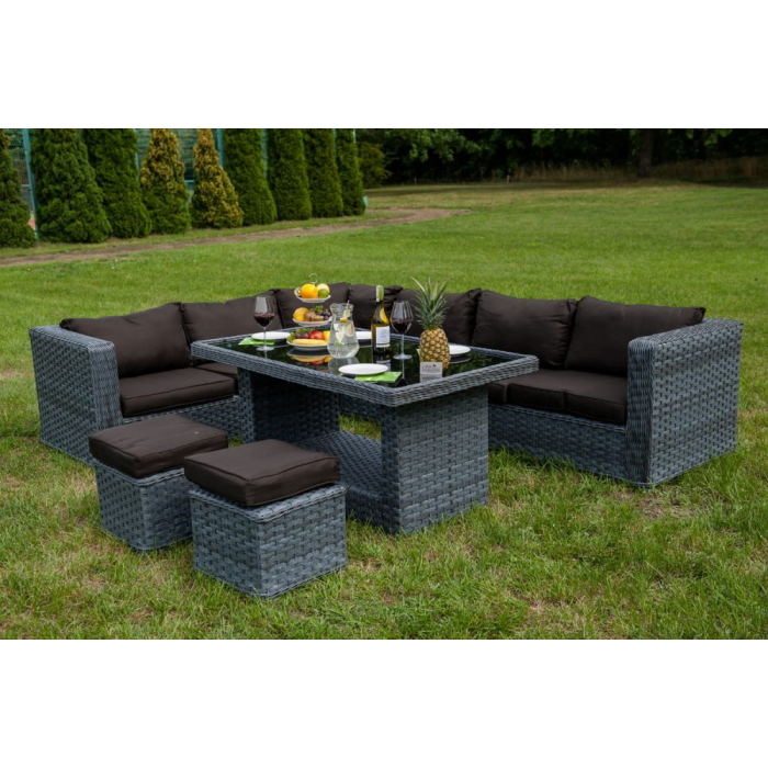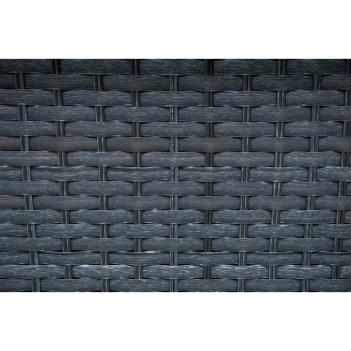 Tmavohnedé vankúše na sedadlá a operadlá v stanovenej cene (8 ks na sedadlá, 7 ks na operadlách). Všetky majú odnímateľné kryty na zips, vyrobené z nepremokavého materiálu (100% polyester), ktorý sa dá prať pri nízkych teplotách. Vankúše boli šité z vysoko kvalitnej látky spomaľujúcej horenie potiahnutej teflónom, ktorá ich chráni pred vlhkosťou. Vankúšová výplň je vyrobená z vysoko kvalitnej čalúnenej peny (stredne tvrdá - T25), ktorá zabraňuje deformácii. Hrúbka vankúša: 12 cm Technorattan je odolný proti nepriaznivým poveternostným podmienkam, zatiaľ čo kvôli nezmenenému vzhľadu nábytku vám odporúčame zakúpiť si ochranný poťah. Tmavosivý poťah je z jedného kusu a na spodnej strane má sťahovaciu šnúrku, ktorá je prepletená kovovými očkami.