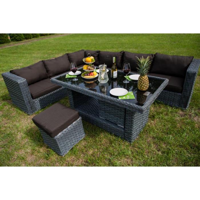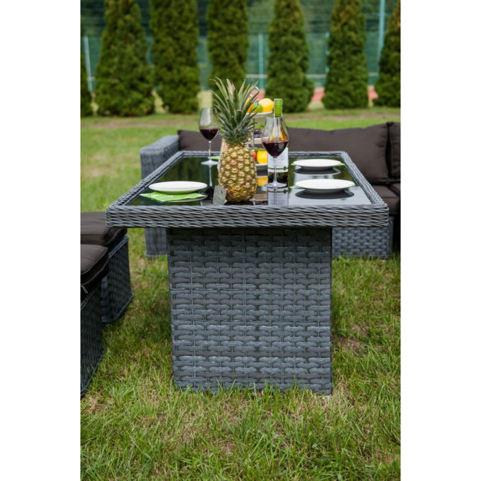 Nábytok je vyrobený zo syntetického ratanu, aby sa zaistilo najvyššie pohodlie pri používaní. Škodlivé poveternostné podmienky ho ničivo neovplyvňujú. Tkaniny Technorattan nezmiznú a nenapínajú sa kvôli dlhodobému slnečnému žiareniu. Prámik neabsorbuje vlhkosť alebo praskliny pri extrémnych teplotách. Modulárna štruktúra súpravy Technorattan vám umožňuje usporiadať priestor podľa vašich potrieb. Mäkké vankúše vyrobené z masívu zvyšujú kvalitu a pohodlie odpočinku. Farba sady MAESTOSO: vresovo šedá, pletenie: 17 mm x 1,2 mm plochý technorattan a guľatý technorattan, hladká štruktúra. Nábytok: hliník
