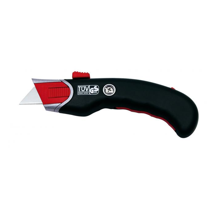 Nôž sa vysúva pomocou bežca, ktorý treba počas rezania držať, čo zvyšuje bezpečnosť rezania. Vhodný pre pravákov i ľavákov vďaka umiestneniu bežca v strede rezača. Integrovaný zásobník obsahuje 5 náhradných nožov. Šírka čepele 25 mm. Schválené inštitútom TÜV. Farba čierna/ červená.