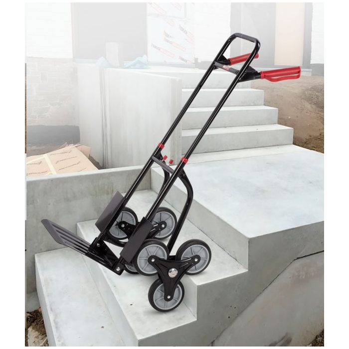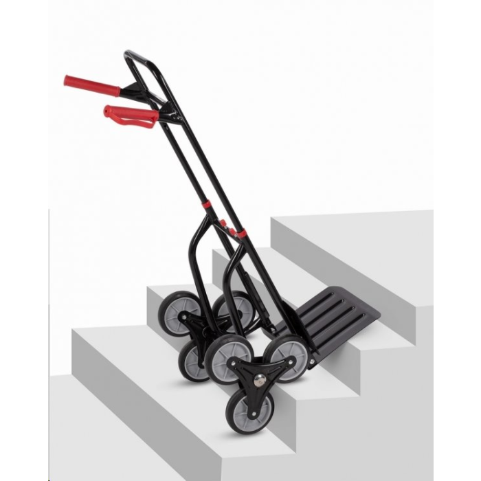 Schodisková rudla, nosnosť 120 kg, 6 kolies, sklopná oceľová lopata 300 x 290 mm, pevný oceľový rám, gumové rukoväte s okami, skladateľné prevedenie.