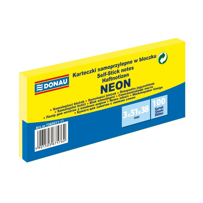 Lepidlo nanesené po dlhšej strane, zmývateľné vodou. Udelený Green Point. 3 bločky vo fólii s červeným pruhom na uľahčenie otvárania. Väčšie balenie 36 ks. Farba neónovo žltá.