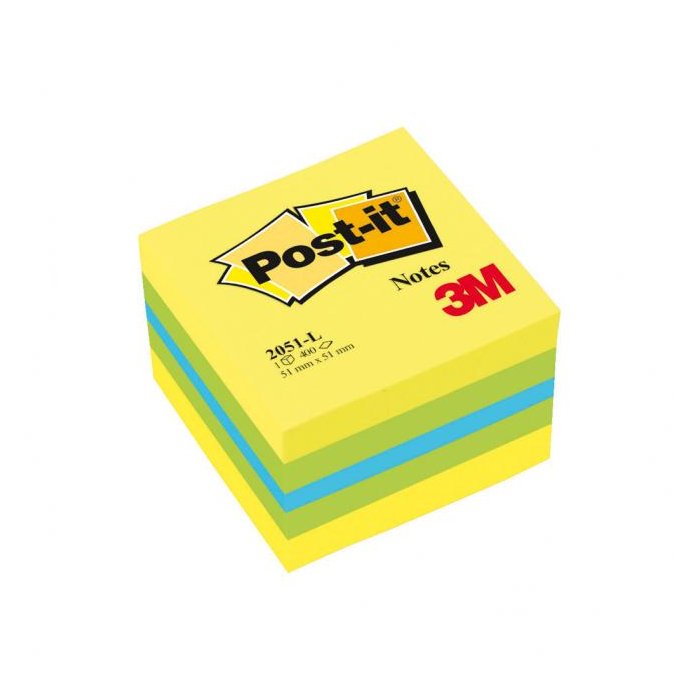 Malé samolepiace lístky v tvare kocky, 400 lístkové, v 3 farbách: neónová žltá (2 × 100 lístkov), ultramodrá (50 lístkov), ultrazelená (2 × 75 lístkov).