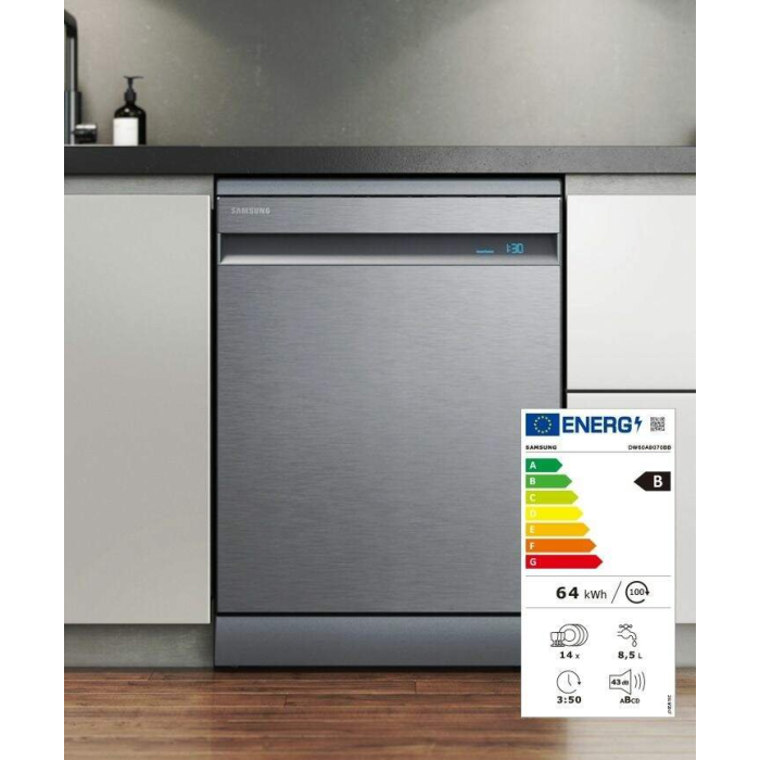 Získajte dokonale čistý riad pri oveľa nižších účtoch za elektrickú energiu. Moderné umývačky od spoločnosti Samsung spĺňajú prísne normy nového európskeho systému ekologických štítkov, ktorý je v platnosti od roku 2021, pričom tento konkrétny model patrí do energetickej triedy B. To všetko pri zachovaní vysokého čistiaceho výkonu s množstvom moderných funkcií.