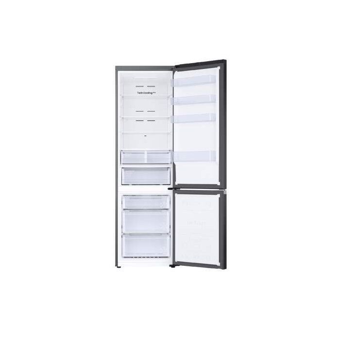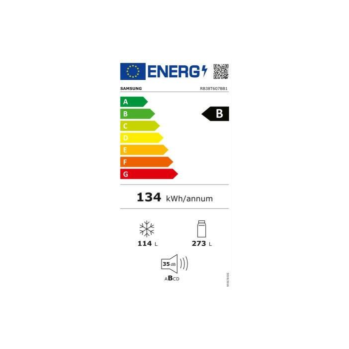 Kombinovaná chladnička Samsung RB38T607BB1/EF v čiernom prevedení. Chladnička má objem 273 litrov. Vo vnútri nájdete sklenené police, jeden box Optimal Fresh+ a jeden box Humidity Fresh. Vo dverách chladničky nájdete police. Mraznička s 3 boxmi má 114 litrov, v prípade výpadku je výdrž až 9 hodín a za 24 hodín zmrazí až 8 kg potravín. Využíva technológiu NoFrost pre automatické odmrazovanie, funkciu Rýchle zmrazenie a rýchle chladenie. Hladina hluku dosahuje len 35 dB vďaka inventorovému motoru.