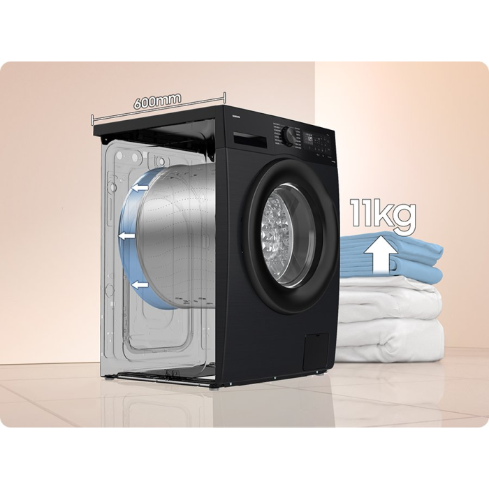 Z vonkajšej strany má práčka štandardnú hĺbku 600 mm, takže bez problémov zapadne na svoje miesto. Vďaka riešeniu SpaceMax je však k dispozícii bubon s ohromujúcou kapacitou 11 kg. Či už potrebuješ vyprať veľké množstvo oblečenia, ktoré sa do bežnej práčky nezmestí alebo typickú rodinnú hromadu – práčka túto úlohu hravo zvládne.