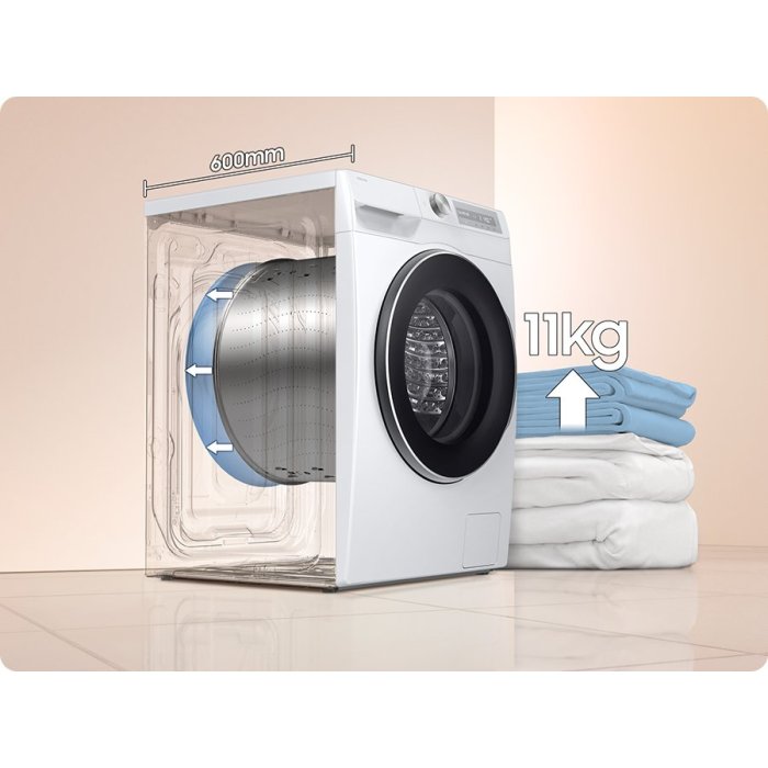Z vonkajšej strany má práčka štandardnú hĺbku 600 mm, takže bez problémov zapadne na svoje miesto. Vďaka riešeniu SpaceMax je však k dispozícii bubon s ohromujúcou kapacitou 11 kg. Či už potrebuješ vyprať veľké množstvo oblečenia, ktoré sa do bežnej práčky nezmestí alebo typickú rodinnú hromadu – práčka túto úlohu hravo zvládne.