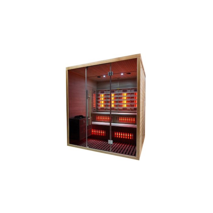 Táto sauna v sebe kombinuje ako fínsku saunu, tak aj infrasaunu. Pokiaľ nemáte radi v saune tak vysokú teplotu, oceníte možnosť zapnutia iba infračervených žiaričov. V saune je 8 karbónových ohrievačov. Kachle fínskej sauny pracujú na základe termoterapie – liečebnej metódy, ktorá využíva priaznivé účinky mierneho prehriatia tkanív. Súčasné zapnutie saunových pecí a žiaričov možné nie je.