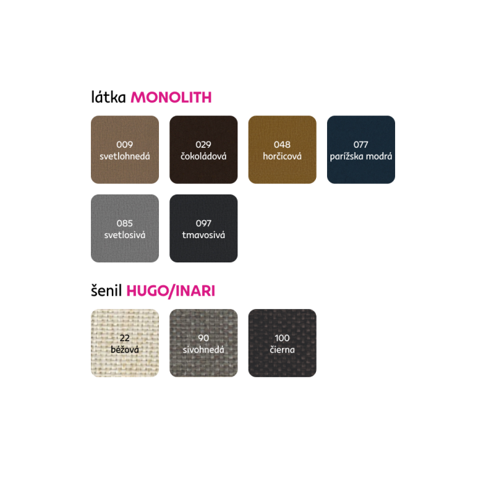 Možnosť objednania v 6 farebných prevedeniach látky Monolith a v 3 farebných prevedeniach látky Hugo/Inari v cene 1.139 Eur. Pri individuálnej objednávke je potrebné zaplatiť 20% zálohu z danej sumy. Po uhradení zálohy bude Vaša požiadavka zadaná do výroby. Doba dodania 6-8 týždňov.