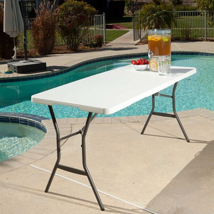 Skladací stôl vhodný do izby, na záhradu, do dielne. Kombinácia oceľovej nosnej kostry a vysoko odolného UV stabilizovaného polyetylénu (HDPE). Odolnosť voči vplyvu počasia. Plast na slnku nežltne ani nekrehne. Stôl je možné jednoducho zložiť na polovicu.