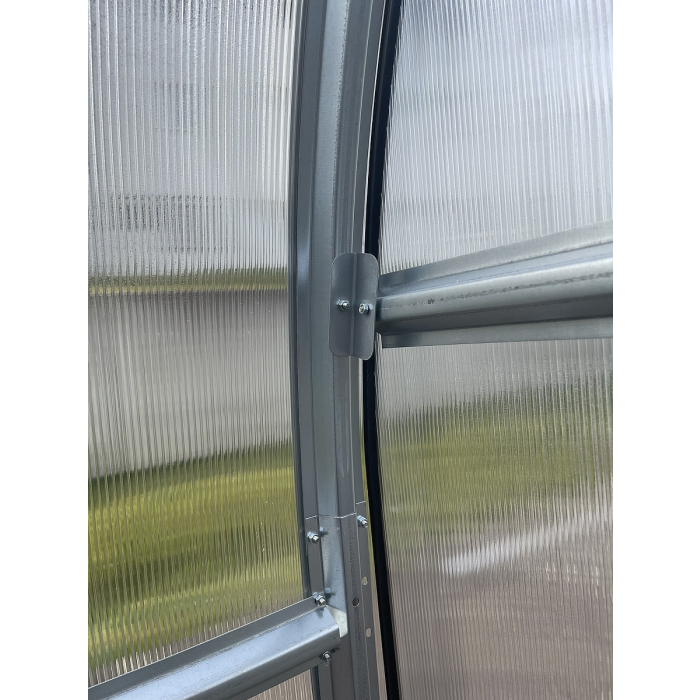 Tento model skleníka obsahuje oceľové vodorovné spojovacie lišty na plastové presklenie, takže polykarbonátové dosky sú dodávané už predrezané na menšie formáty (max. 1,05 x 2 m) a zabalené v kartóne. Z týchto menších formátov je možné už veľmi jednoducho dorezať potrebné zaoblené dielce na opláštenie. Nemusíte tak zložito manipulovať s celými veľkými polykarbonátovými doskami. Skleník je možné aj oveľa jednoduchšie uskladniť. ODPORÚČAME!
