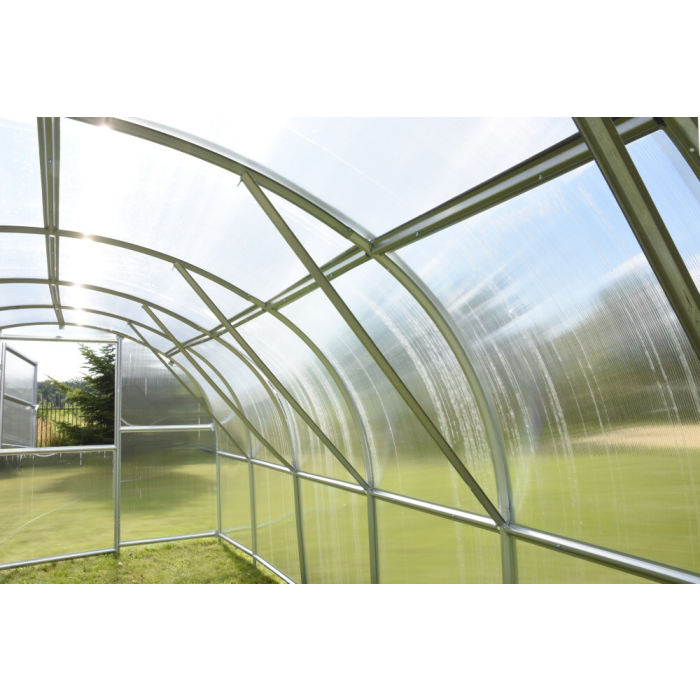 | oblúkový skleník LANITPLAST TIBERUS | pozinkovaný oceľový profil 1mm, rozostup oblúkov 100 cm, dvojité dvere vpredu, ventilačné okno vzadu, presklenie nutné vyrezať z dodaných polykarbonátových dosiek, možnosť montáže strešného okna - áno |