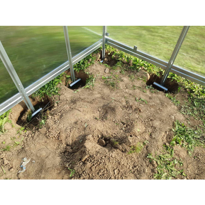 Skleník nepotrebuje žiadnu podmurovku, pretože konštrukcia skleníka je pripravená na zapustenie do zeme do hĺbky cca 20 - 25 cm. Do dier v zemi sa zasunú kotevné profily v tvare obráteného veľkého písmena T, ktoré sa zabetónujú. Skleník je možné ukotviť aj na drevenú / murovanú / betónovú podmurovku, vyžaduje to však drobné kutilské zásahy a predovšetkým domáce vyrobenie atypických plechových L úchytiek na priskrutkovanie profilov k podmurovke (výrobca ukotvenia skleníka na podmurovku nepredpokladá). Bližší popis ukotvenia skleníka do zeme alebo na podmurovku nájdete v súbore "Ako ukotviť oblúkový skleník", ktorý je umiestnený na záložke Návody.