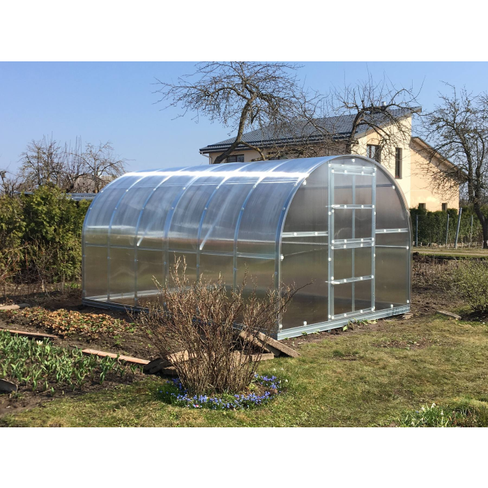 Tento model skleníka je osadený pozinkovanou oceľovou základňou vysokou cca 10 cm, na ktorej hornej hrane sú ukončené polykarbonátové dosky. Tie potom vďaka tomuto konštrukčnému riešeniu neprichádzajú do kontaktu s pôdou. Pokiaľ navyše použite okrajový PC U-profil (príplatkové príslušenstvo), tak zásadným spôsobom ochránite polykarbonátové dosky pred vlhkosťou a rôznymi nečistotami, ktoré by sa na ne dostávali z pôdy. Skleník má zmenšenú rozteč oblúkov na 67 cm = má vyššiu únosnosť na snehové zaťaženie. ODPORÚČAME!
