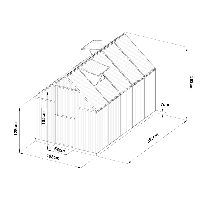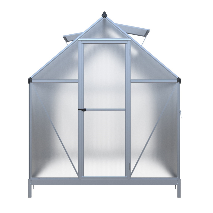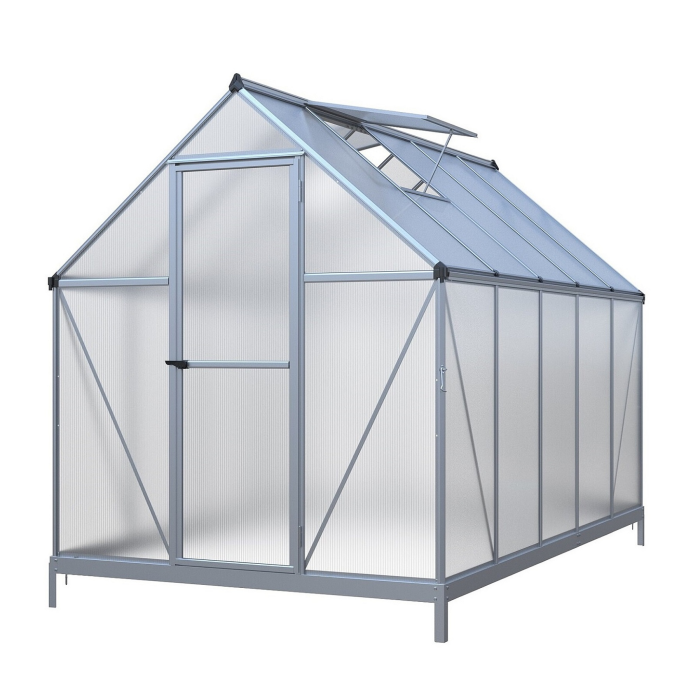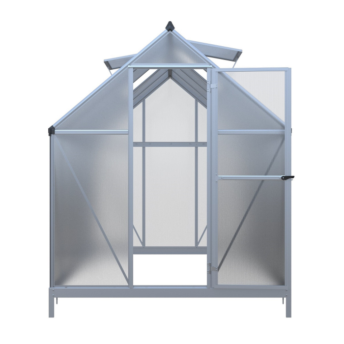 Hliníkový skleník, š 1,82 x d 3,03 m, strieborný, 2x str. okno, polykarbonát 4 mm, dvere na pántoch, plocha 5,51 m2.