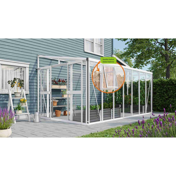 Obsahom balenia sú dvojkrídlové posuvné dvere (š x v otvore = 1,19 x 1,77 m), AL profily, presklenie, 3x bočné ventilačné okienko s manuálnym otváraním, 1x odkvapový žľab vrátane dvoch zvodov, 1x cylindrický zámok. Ku skleníku je možné dokúpiť rad nadštandardného príslušenstva - poličky, regály, ďalšie vetracie strešné aj bočné okienka, automatické otvárače k týmto okienkom, teplomery, vlhkomery, zavlažovacie zariadenia, elektrické odporové vykurovanie pôdy. Balené v papierovom kartóne. Presklenie je zabalené v nevratnej drevenej debne.